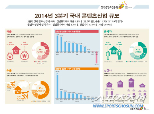 보고서에 따르면, 2014년 3분기 콘텐츠산업 매출액과 수출액은 지난해 같은 기간에 비해 각각 1.2조 원(4.9%), 2.1억 달러(11.7%) 늘어난 23.7조 원과 13.9억 달러였다. 그 중 게임 산업은 약 13.9억 달러 중 56.2%를 차지해 전체 수출액의 절반이 넘는 비중으로 영향력을 보였다. 3분기 콘텐츠산업 매출부문을 견인한 분야는 콘텐츠솔루션(13.4%), 영화(12.3%), 방송(7.7%) 등으로 전년 동기 대비 10% 내외의 성장률을 기록했다. 수출부문에서는 영화(289.4.%), 지식정보(21.1%), 캐릭터(17.4%) 등이 성장을 주도했다.