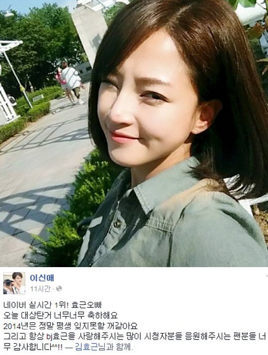 23일 이신애는 자신의 페이스북에 "네이버 실시간 1위! 효근오빠 오늘 대상탄 거 너무너무 축하해요. 2014년은 정말 평생 잊지 못할 거 같아요. 그리고 항상 bj효근을 사랑해주시는 많은 시청자분들, 응원해주시는 팬분들 너무 감사합니다^^!! 김효근님과 함께"라는 글을 남기며 남편을 향한 애정을 과시했다.