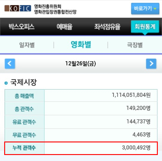 영화진흥위원회 영화관입장권통합전산망 배급사 집계기준에 따르면 '국제시장'은 26일 오후 12시 30분 기준 누적관객수 300만 492명을 기록했다. 크리스마스 하루에만 54만 2653명을 동원하며 박스오피스 부동의 1위 자리를 지켜왔던 '국제시장'이 개봉 10일 만에 300만 고지를 밟은 것. 이는 '광해, 왕이 된 남자'(2012, 누적관객수 1232만 3408명), '수상한 그녀'(2014, 누적관객수 865만 8002명)보다 하루 빠른 기록이며 '7번방의 선물'(2013, 누적관객수 1281만 1213명)과 동일한 속도라 앞으로의 흥행 성적에 대한 기대를 모으고 있다.