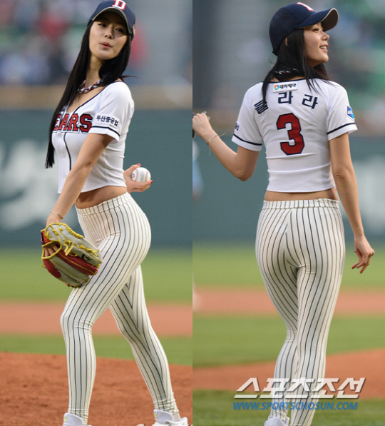 특히 몸매가 적나라하게 드러난 시구 패션으로 마운드에 오른 클라라는 시구하기 전 포수 양의지와 사인을 주고받으며 요염한 'S라인' 포즈를 취해 시선을 집중시켰다.