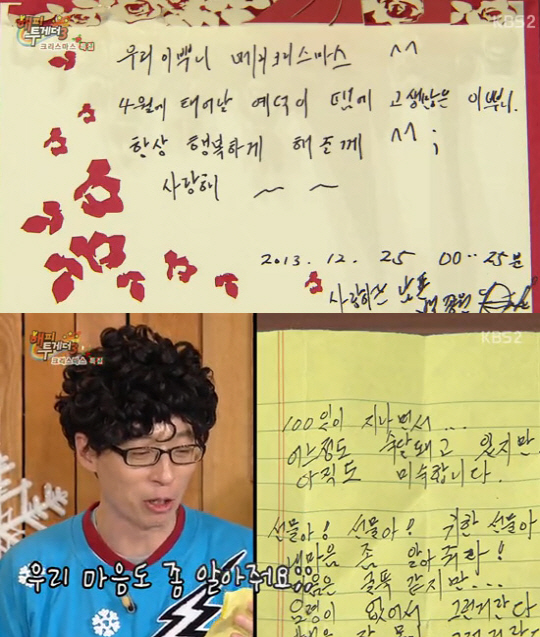 특히 유재석은 연애한지 100일날 받은 노란색 종이에 쓰인 백종원의 손편지를 직접 낭독했다.