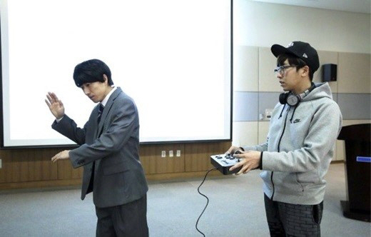 사진에는 '로봇 연기'의 달인 장수원이 로봇처럼 포즈를 취하고 있는 모습이 담겨 있다. 그 뒤에서 백승룡 PD는 장수원을 리모컨으로 조종하고 있어 보는 이들의 웃음을 자아낸다.