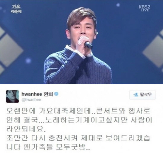 27일 환희는 자신의 트위터에 "오랜만에 가요대축제인데 콘서트와 행사로 인해 결국 노래하는 기계이고 싶지만 사람이라 안되네요. 조만간 다시 충전시켜 제대로 보여드리겠습니다. 팬가족들 모두굿밤"이라고 글을 남겼다.