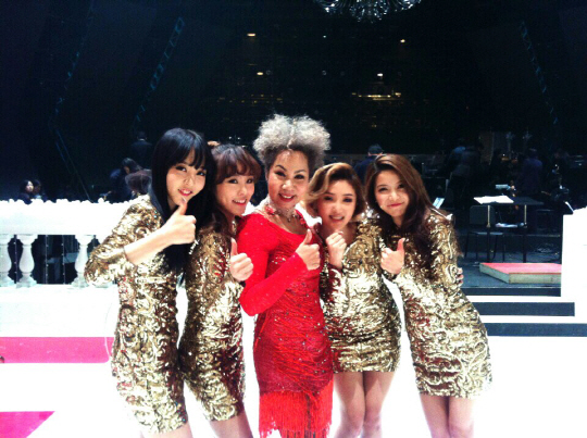 골드 빛의 블링블링한 원피스로 슬림한 몸매와 한껏 물오른 미모를 뽐내고 있는 마마무 사이에서 강렬한 붉은 색의 드레스를 차려 입은 인순이는 후배 마마무와 조화를 이루며 시선을 사로잡고 있다.