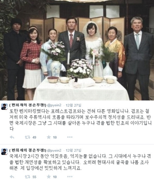 이어 "국제시장 2시간 동안 억지웃음, 억지눈물 없습니다. 그 시대에서 누구나 겪을 법한 개연성을 확보하고 있습니다. 오히려 현대사의 굴곡을 나름 조사해본 제 입장에선 밋밋하게 느껴지죠"라고 덧붙였다.