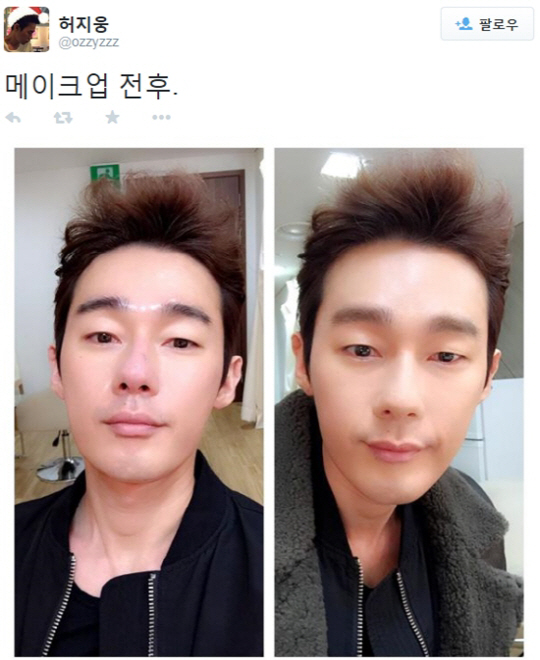 허지웅은 28일 오후 자신의 트위터 계정을 통해 "메이크업 전후"라는 단문의 글과 함께 한 장의 사진을 게재했다.
