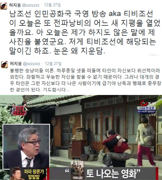 허지웅은 지난 27일 자신의 트위터 계정을 통해 "남조선 인민공화국 국영 방송 aka 티비조선이 오늘은 또 전파낭비의 어느 새 지평을 열었을까요. 아 오늘은 제가 하지도 않은 말에 제 사진을 붙였군요. 저게 티비조선에 해당되는 말이긴 하죠"라는 글을 남겼다.