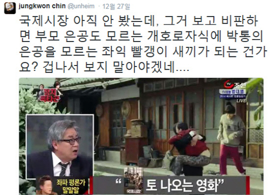 이에 27일 진중권은 자신의 트위터에 "'국제시장' 아직 안 봤는데, 그거 보고 비판하면 부모 은공도 모르는 xxx자식에 박통의 은공을 모르는 좌익 빨갱이 xx가 되는 건가요? 겁나서 보지 말아야겠네"라고 적었다.