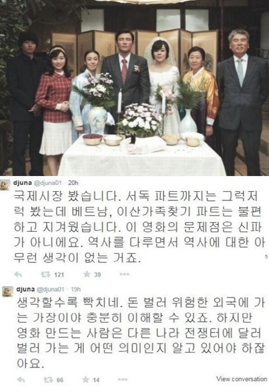 듀나는 지난달 27일 자신의 트위터에 "국제시장 봤는데 서독 파트까지는 그럭저럭 봤지만 베트남, 이산가족 찾기 파트는 불편하더군요"라며 "역사를 다루면서 역사에 대한 아무런 생각이 없는 거죠"라는 글을 남겼다.