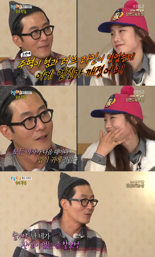 그러자 멤버들은 "질투 때문이냐"고 물었고, 이슬기 작가는 "질투 아니다"라고 말했다. 하지만 김주혁은 자리에서 벌떡 일어나 "슬기야. 난 네가 관심이 없는 줄 알았다"며 너스레를 떨어 웃음을 자아냈다.