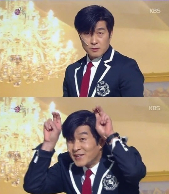 이날 김상중은 20살 유아인으로 김대희의 친동생이자 아이돌 지망생 '유상중'으로 소개돼 교복차림으로 무대에 올랐다.