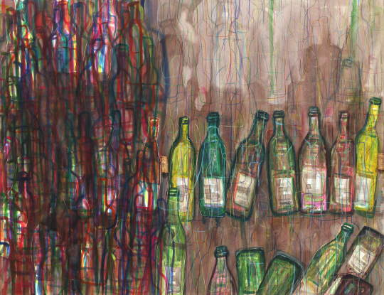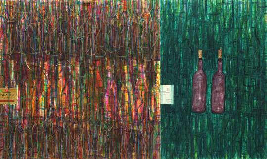 이번 작품들은 콜라주(Collage) 기법을 이용해 와인의 감촉을 닦아내듯 표현했다. 또한 색연필을 사용해 부드럽게 그려내 재료 특유의 감성적인 느낌을 살렸다. 와인병의 굴곡지고 입체적인 표면을 평면 위에서 더욱 효과적으로 나타내기 위한 시도다. 아울러 수채화지에 와인을 뿌리는, 해프닝(Happening) 기법을 사용해 화폭의 안에서 밖으로 흐르는 얼룩이 수많은 표정을 만들어 냈다. 작가는 "와인의 향이 은은하게 베기를 바랐다. 실재적인 향이 아니라 와인 자체가 갖고 있는 상징적인 의미의 그것이 작품 곳곳에 퍼지리라고 생각했다"며 "이런저런 소소한 담소를 즐기면서 짓눌림에서 벗어나 자유를 얻을 수 있었다"고 덧붙였다. 김형중 기자 telos21@sportschosun.com