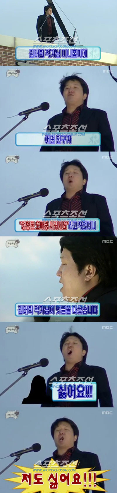 정형돈은 "어떤 친구가 김태희 작가님 미니홈피에 '정형돈이랑 사귀세요'라고 적었는데 김태희 작가님이 '싫어요' 댓글을 다셨다"며 "저도 싫어요"라고 외쳐 웃음을 유발했다.
