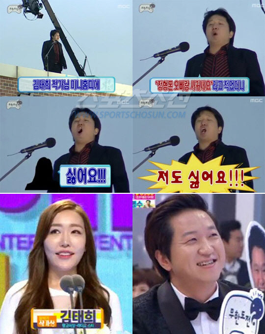 정형돈은 "특별히 김태희 작가한테 한 말씀 하겠다. 며칠 전에 김태희 작가 미니홈피에 어떤 친구가 '정형돈 오빠랑 사귀세요'라고 글을 적었더니 김태희 작가가 그 글에 댓글을 '싫다'고 댓글을 달았다고 한다. 나도 싫다"고 돌직구를 날렸다. <스포츠조선닷컴>