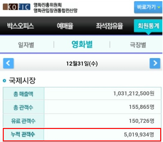 '국제시장'의 500만 돌파 속도는 2012년 추석 극장가에서 흥행 돌풍을 일으킨 '광해, 왕이 된 남자'(누적 1232만3408명)보다 3일 빠르고, 2013년 겨울 극장가에 흥행 신드롬을 일으킨 '7번방의 선물'(누적 1281만12123명)보다는 2일 빠른 것으로 앞으로의 흥행 추이에 대한 기대감을 더한다.