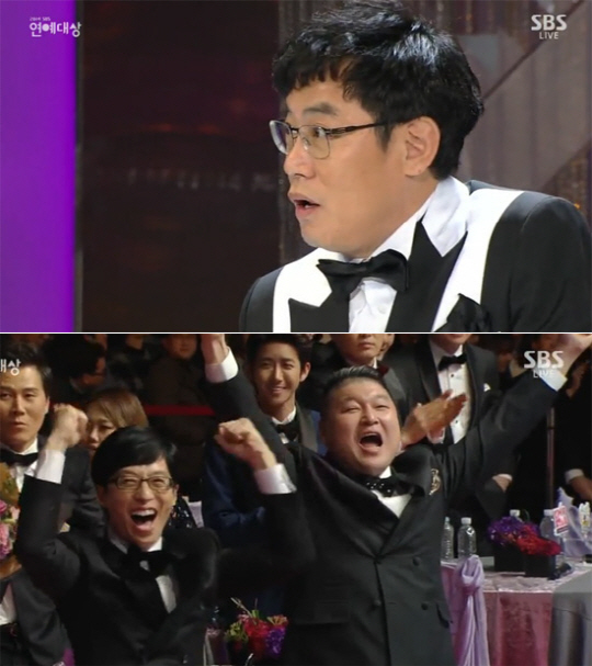이경규의 이름이 호명되자, 대상 후보였던 유재석 강호동은 자리에서 일어나 손을 번쩍 들며 진심어린 축하를 건넸다. 희극인 후배들도 박수를 보내며 대선배 이경규의 수상을 축하했다.