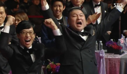 특히 이경규의 이름이 호명되자, 대상 후보였던 유재석 강호동은 자리에서 일어나 손을 번쩍 들며 진심어린 축하를 건넸다. 희극인 후배들도 박수를 보내며 대선배 이경규의 수상을 축하했다.