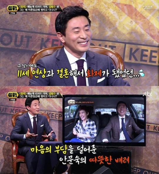 이날 김구라는 "시청자들이 김범수가 안문숙과 잘 될 수도 있겠다고 느끼는 이유는 김범수가 실제로 이혼 경력이 있기 때문인 것 같다. 그때도 11살 연상과 불같은 사랑을 했기 때문"이라고 분석했다.