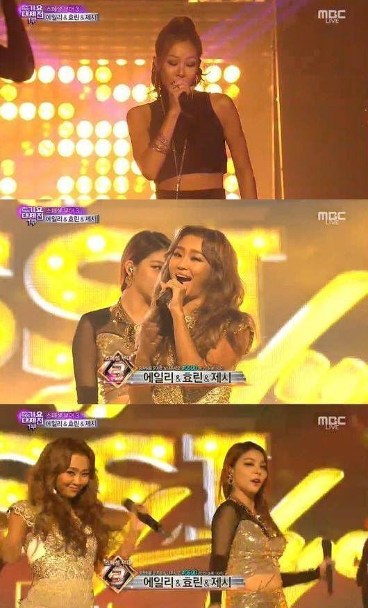 효린-에일리-제시는 지난달 31일 일산 MBC드림센터와 상암 MBC신사옥에서 이원 생중계로 진행된 2014 MBC 가요대제전에서 함께 콜라보레이션 무대를 펼쳤다.