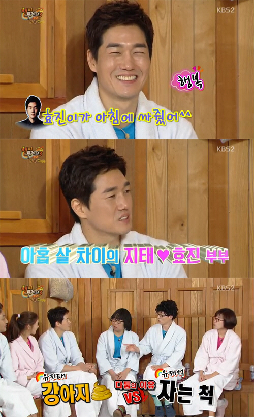 이에 다른 출연진들은 질투하며, 유지태 김효진의 부부싸움에 대해 집요하게 추궁했다. 하지만 유지태는 "우리는 나이 차이가 조금 난다. 9살 차이다"라며 부부싸움에 대해 쉽게 말하지 않았다.
