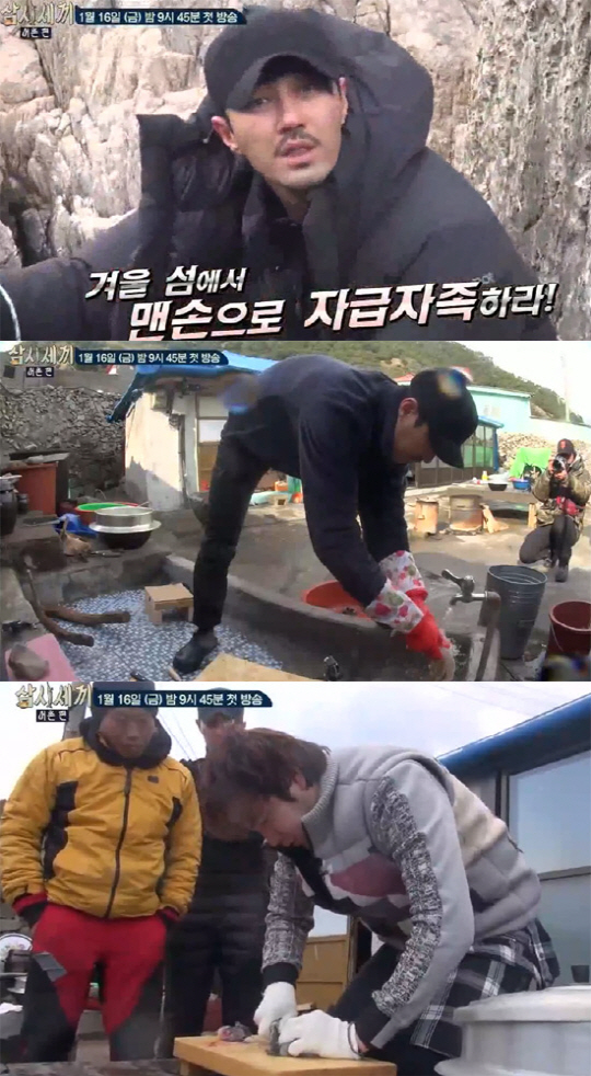 '삼시세끼-어촌편'은 도시에서 쉽게 해결할 수 있는 '한 끼' 때우기를 낯선 어촌에서 가장 어렵게 해 보는 야외 버라이어티 프로그램으로, 차승원, 유해진, 장근석이 출연한다. <스포츠조선닷컴>