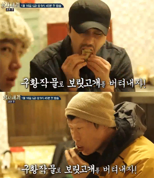 특히 차승원 유해진 장근석은 김치랑 감자만 놓인 조촐한 밥상에서 감자를 폭풍 흡입하는 모습을 보이며 시청자들의 궁금증을 높이고 있다.