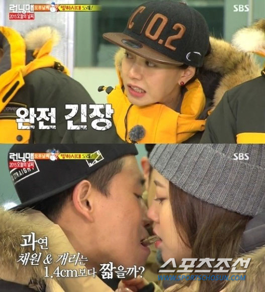 두 사람은 4일 방송된 SBS 예능프로그램 '일요일이 좋다-런닝맨'(이하 '런닝맨')에서 얼음 과자를 사이에 두고 입술을 가까이에 댔다.