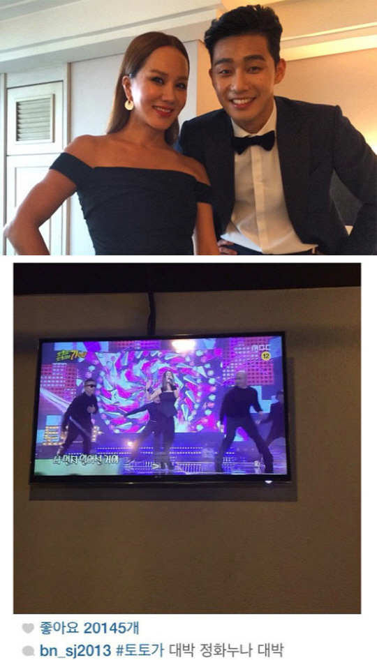 지난 3일 박서준은 자신의 인스타그램을 통해 "토토가 대박 정화누나 대박"이라는 글과 함께 '토토가'에 출연한 엄정화의 TV 속 모습을 게재했다.