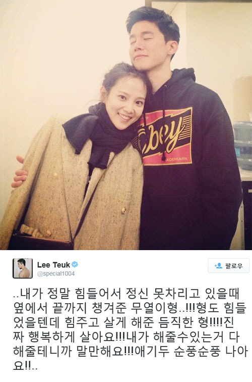 이특은 5일 자신의 트위터를 통해 "무열이 형 승아 씨 축하해요!"라는 두 사람의 결혼 소식에 축하의 메시지를 게재했다.