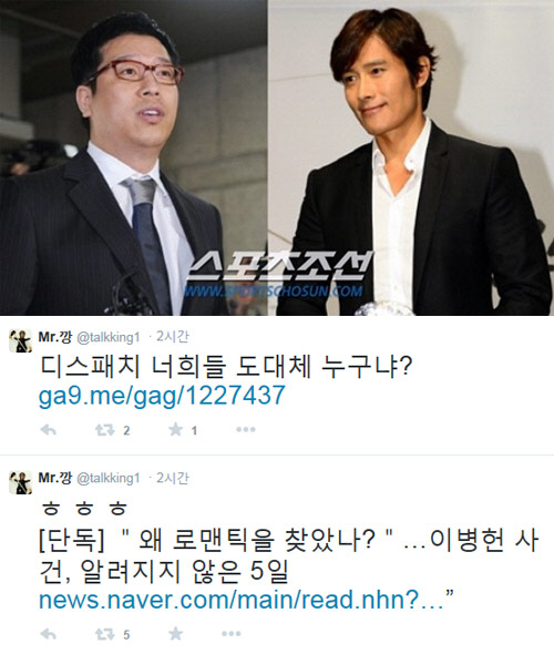 강병규는 5일 자신의 트위터에 "ㅎㅎㅎ", "'디스패치' 너희들 도대체 누구냐?"라는 글과 함께 '이병헌 사건, 알려지지 않은 5일'이라는 제목의 '디스패치' 기사를 링크했다.