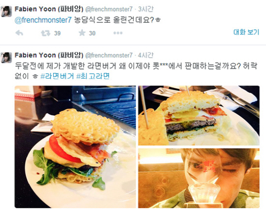 파비앙은 6일 트위터를 통해 "두 달 전에 제가 개발한 라면버거. 왜 이제야 롯○○○에서 판매하는 걸까요? 허락 없이"라는 글과 함께 사진을 게재했다.