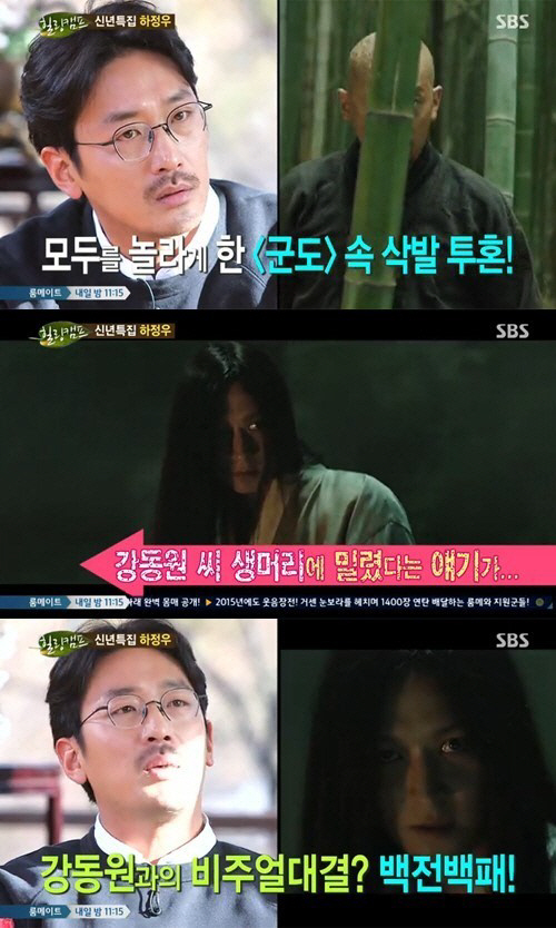 이날 방송에서 하정우는 "영화 '군도'에서 삭발 투혼을 벌였지만 강동원의 생머리에 밀렸다"는 후문에 대해 "강동원 앞에서는 누구도 살아남을 수 없다"고 말해 웃음을 자아냈다.