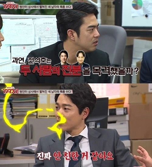 이를 듣던 전석호는 "두 사람이 함께 있는 것을 몇 번 봤는데 겉으로 보기엔 정말 안 친한 것 같다"며 "그래서 우리가 맨날 놀린다. '아~ 메소드다. 둘이 말도 안 해. 대단해'라고 한다"라고 폭로해 웃음을 자아냈다. <스포츠조선닷컴>