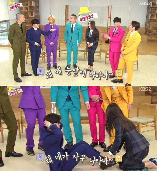 이에 하하는 '시크릿 가든'에서 화제를 모았던 윗몸일으키기 신을 재연해 볼 것을 제안했고, 김범수는 주저 없이 바닥에 누워 노래를 부르며 윗몸일으키기를 해 웃음을 안겼다.