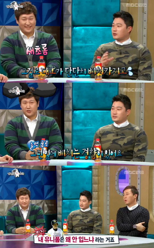 지난 7일 방송된 MBC '황금어장'의 '이 대(vs) 오' 특집에서는 이대호와 오승환, 방송인 정준하가 출연해 재치 있는 입담을 뽐냈다.