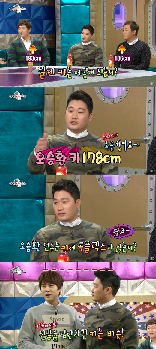 이를 들은 규현은 "나도 키가 178cm이다"라고 말했고, 다른 출연자들은 두 사람에게 키를 재볼 것을 권유했다. 운동화 굽까지 따지며 승강이를 벌이던 오승환과 규현은 키가 거의 비슷한 것으로 결론지었다. <스포츠조선닷컴>