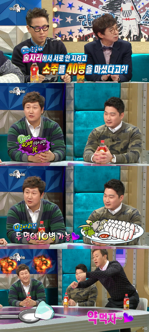 이에 이대호는 "40병 마시면 죽는다. 둘이서 10명은 마신다"고 말했고, 오승환은 "둘 다 마시는 속도가 빠르다 보니까 각자 5병씩 마시는데 순식간에 다 마신다"고 설명했다.
