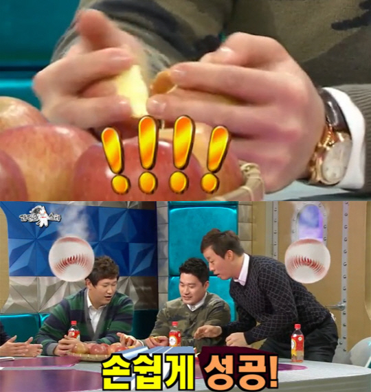 이어 오승환은 사과를 보더니 여유로운 미소를 지으며 "옆결로 쪼개기에 도전하겠다"고 말했다. 오승환은 사과를 단 1초 만에 쪼개는데 성공, 모두를 놀라게 했다. 게다가 사과를 8조각으로 만드는데도 성공하며 놀라움을 더했다.