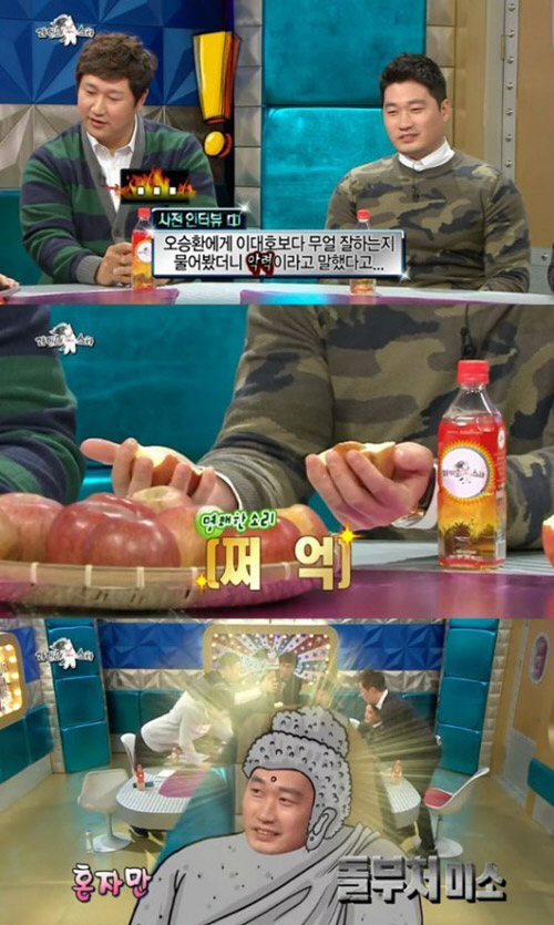 이날 방송에서 MC들은 "사전 인터뷰때 오승환에게 이대호보다 잘하는게 뭔지 물어봤더니 '악력'이라고 말했다"며 이들의 악력을 알아보기 위해 맨손으로 사과 쪼개기 대결을 준비했다.