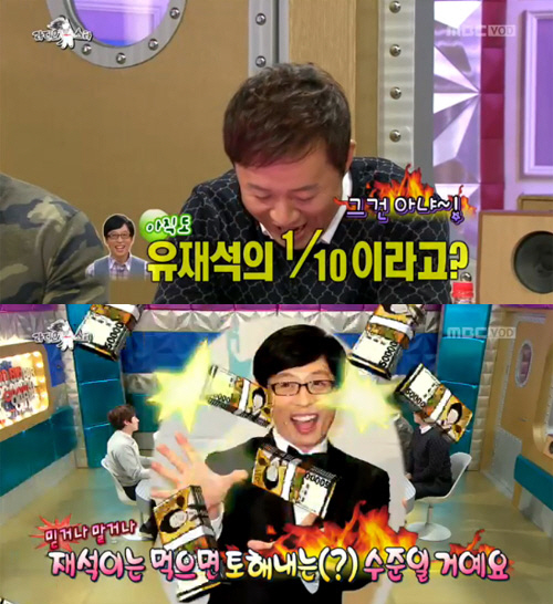 특히 정준하는 "유재석은 아마 더 이상 올릴 수 없을 거다. 상한선이 있을 거다"라는 말에 김구라는 "유재석은 먹으면 토해내는 수준 일 것"이라고 덧붙여 웃음을 안겼다.