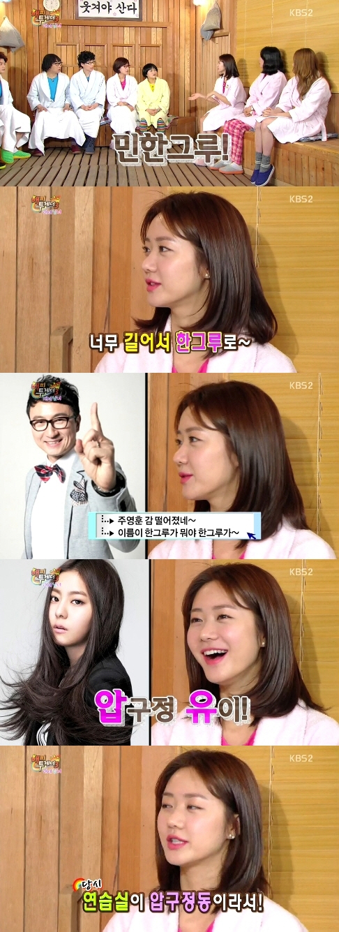 이에 김신영은 "한그루에게 데뷔 전 압구정 유이라는 별명이 있었다"고 말했고, 한그루는 "연습실이 압구정이라 압구정 유이라는 수식어가 생겼더라"고 맞장구를 쳤다.