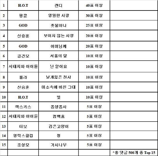 조사에서 1위는 H.O.T의 곡 '캔디'가 차지했다. 이어 핑클 '영원한 사랑', god '촛불하나'가 각각 2위와 3위를 기록했다. 신승훈 '보이지 않는 사랑', 서태지와 아이들 '난 알아요', 룰라 '날개잃은 천사', 영턱스클럽 '정'도 높은 득표율을 기록하며 톱15에 이름을 올렸다.