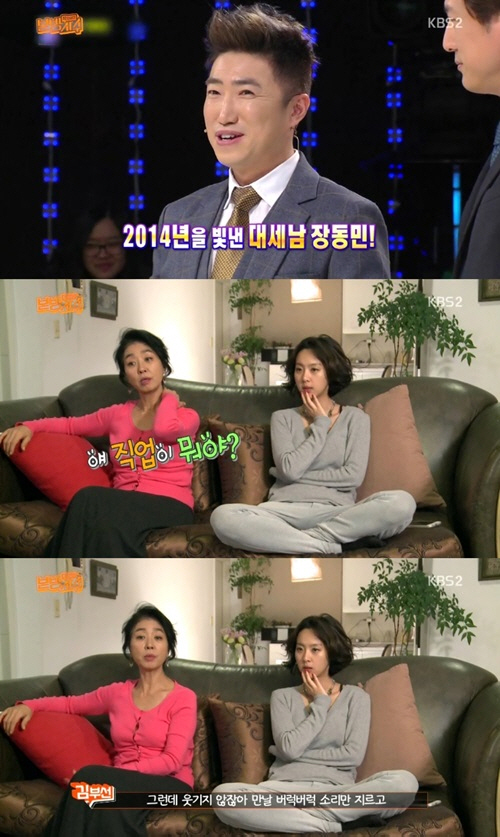 김부선은 장동민을 보며 "얘 요즘 많이 나왔나? 직업이 뭐냐"고 물었다.