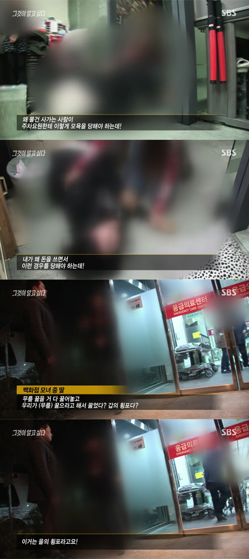 이날 백화점 모녀사건의 당사자인 모녀는 제작진과의 인터뷰에서 "돈을 기쁜 마음에 쓰러 와서 왜 주차요원한테 이런 꼴을 당하냐. 내가 왜 돈을 쓰면서 이런 꼴을 당해야 하냐"며 억울해 했다.