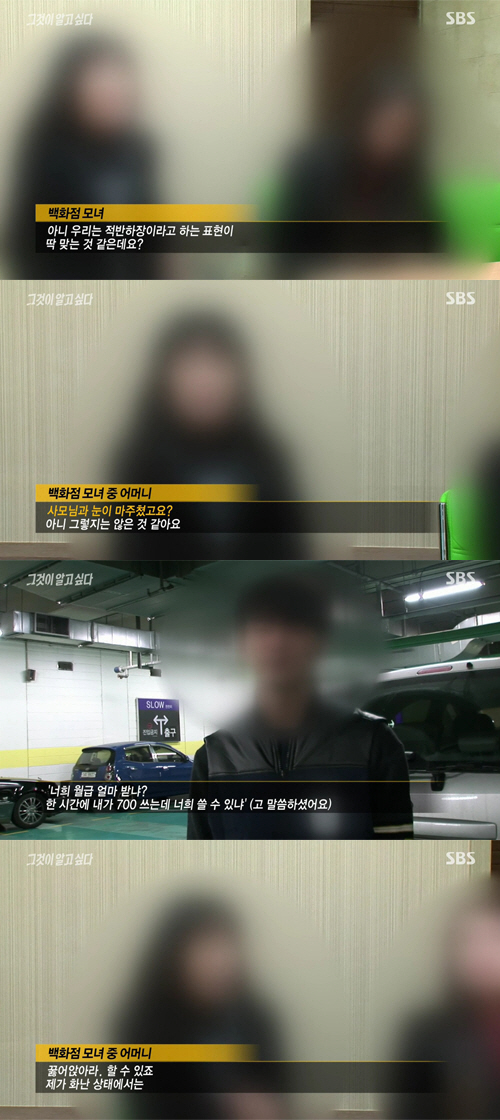 당시 소동을 말리러 왔다가 덩달아 무릎 꿇은 주차요원들은 제작진에게 "(백화점 모녀가)'너희 월급 얼마냐. 한 시간에 내가 700만원 쓰는데 너희는 쓸 수 있느냐'며 우리보고 무릎을 똑같이 꿇으라고 했다. 그 상황에서 꿇을 수밖에 없었다. 우리는 갑이 아니다"라고 털어놨다.