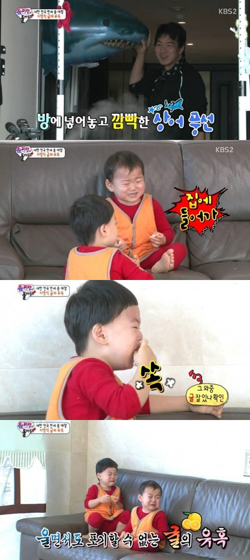 '슈퍼맨이 돌아왔다' 송민국과 만세가 울면서도 귤 먹방을 선보여 웃음을 자아냈다.