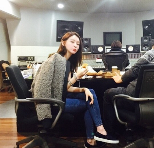 사진 속 강민경은 녹음실 의자에 앉아있는 모습. 편안한 차림을 한 그는 한 손에 음식을 들고 카메라를 응시하고 있다.