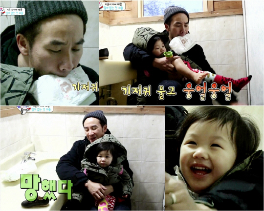 이날 방송에서는 배우 엄태웅과 그의 18개월 된 딸 엄지온의 첫 48시간이 그려졌다. 엄태웅은 협소한 공중화장실에서 입에 일회용 기저귀를 물며 딸의 기저귀를 갈아입히기 위해 고군분투하는 초보아빠의 모습을 보여 웃음을 선사했다.