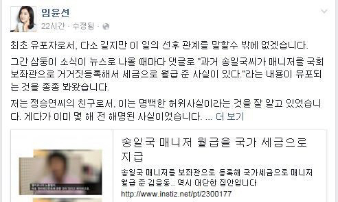 문제의 글은 정승연 씨와 친분이 있는 임윤선 변호사가 친구 공개로 받은 글을 자신의 페이스북에 공개하면서부터 큰 논란을 불러일으켰다. 문제가 일파만파로 확산되자 공개자인 임 변호사는 11일 페이스북을 통해 해명에 나섰다. 그는 "최초 유포자로서, 다소 길지만 이 일의 선후 관계를 말할 수밖에 없다"는 글을 통해 "최근 몇몇 유명 사이트에 해당 시사 프로를 악의적으로 편집한 글들이 자극적인 제목과 함께 올라왔고, 사실이 아닌 글로 가족이 모두 욕을 먹는 상황에서 화가 난 정승연이 친구 공개로 페이스북에 글을 올린 걸 자신이 퍼뜨렸다"고 경위를 설명했다. 이어 그는 "자식까지 싸잡아 허위 사실을 퍼뜨린 사람들에게 알려주고픈 마음이었다. 언니도 나도 워낙 화가 나 있는 상태였기 때문에, 말투가 그리 문제될 것이라는 생각을 못했다. 허위 사실로 욕하던 사람들이 이번에는 쟁점을 바꿔 정승연을 공격 대상으로 바꿔 갑자기 '알바에게 4대 보험따위 대 줄 이유 없다'라고 싸가지 없이 외치는 갑질 인간으로 만들어 버렸다"고 안타까워했다. 임씨는 "난무하는 허위 사실 때문에 화가 난 터라 진실을 알리고파 글을 캡처한 것인데, 나 때문에 이런 파장을 겪게 된 언니에게 매우 미안한 마음"이라고 말했다. 끝으로 "흥분한 상태에서 친구들에게 쓴 격한 표현 하나로 사람을 매도하지 않길 진심으로 부탁드린다. 그리고 저로 인해서 이렇게 문제가 커진 것, 진심으로 죄송하다"고 사과했다.