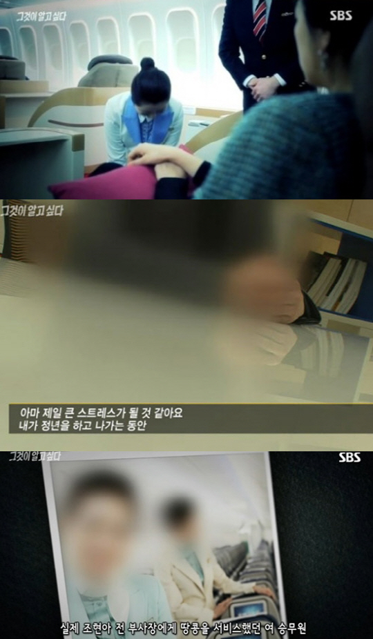 이날 방송에는 익명을 요구한 전현직 대한항공의 승무원은 '땅콩회황'과 관련해 "이번 사건 같은 일은 비일비재하다. 이런 게 뉴스에 나왔다는 게 오히려 의아할 정도"라고 운을 뗐다.